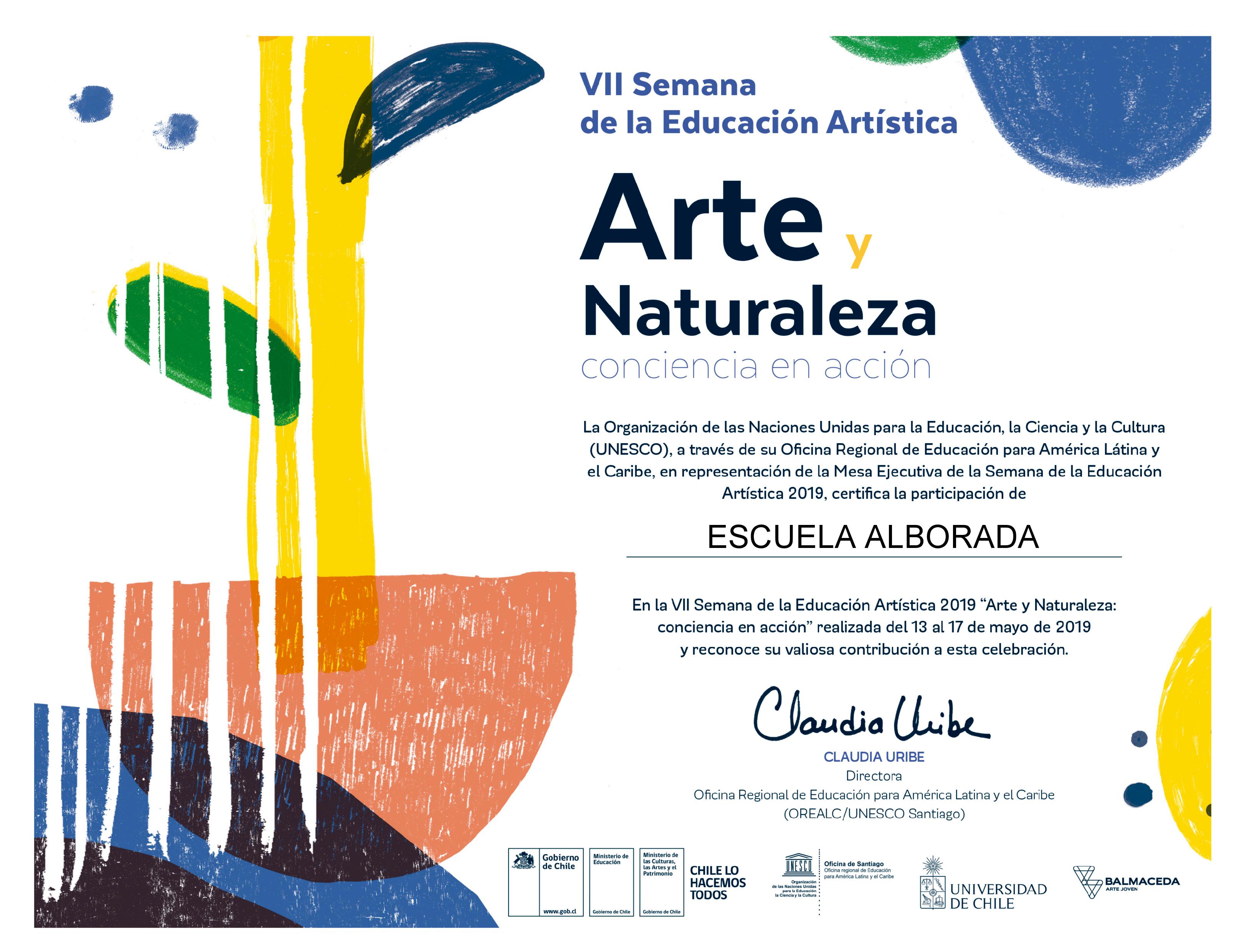 Nuestro sello educativo institucional de “Formación Artística Cultural”, resurgió con fuerza en la “VII Semana de la Educación Artística, (SEA 2019)”, celebrada del 13 al 17 de mayo pasado. En este contexto, nuestra escuela Alborada fue certificada por la UNESCO, tras cumplir cada una de las actividades que marcaron la SEA, bajo el hito nacional de “Arte, Ciencia y Naturaleza: Conciencia en Acción”.
