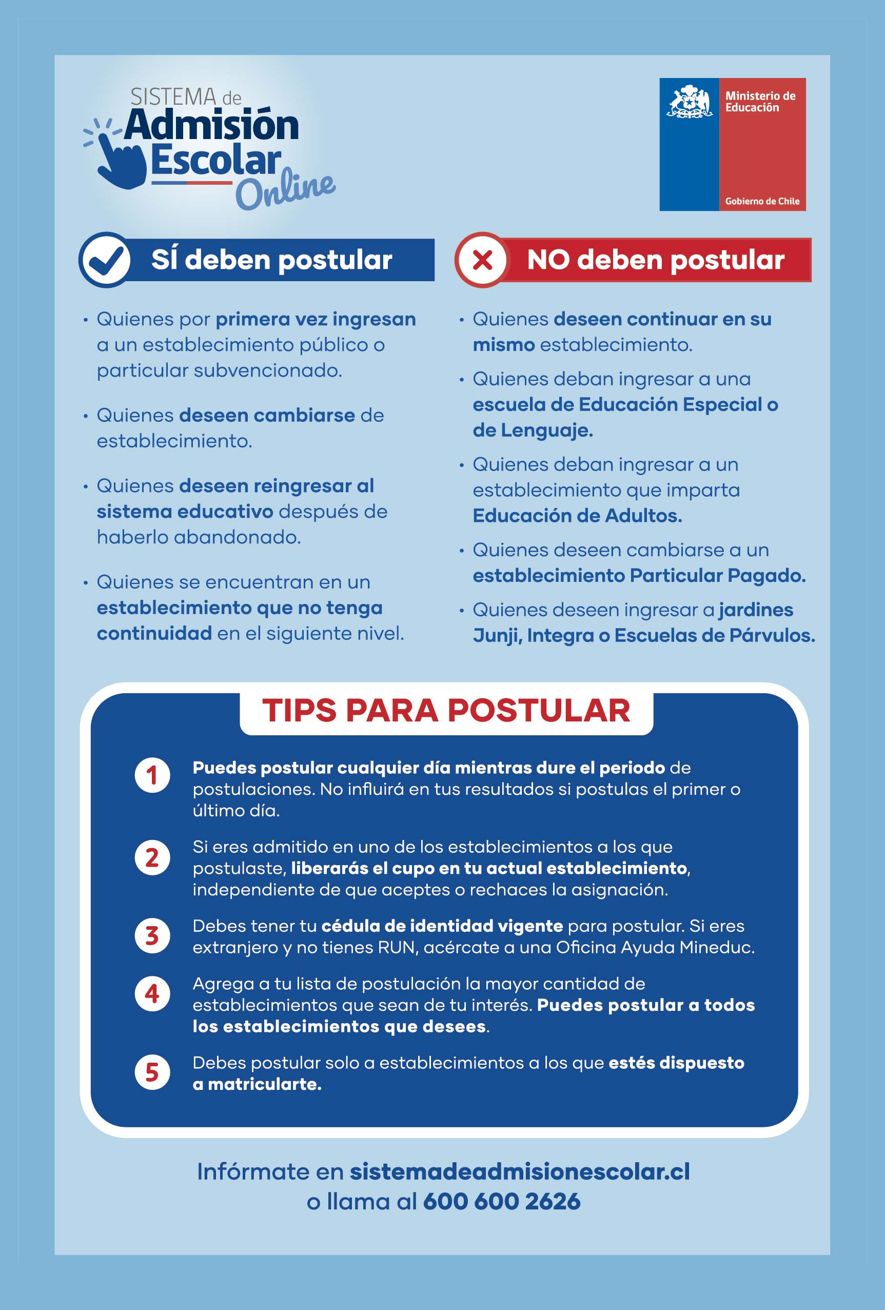 Recordamos que el proceso de postulación va dirigido a los papás que integran por primera vez a sus hijos al sistema escolar en prekinder o quienes cambien de establecimiento.