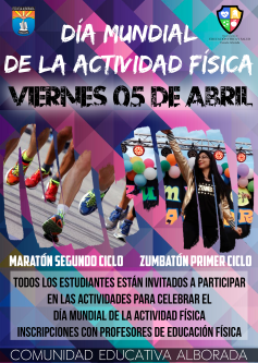 En el marco del "Día Internacional de la Actividad Física", nuestro Departamento de Educación Física y Salud ha organizado dos actividades que se llevarán a cabo este viernes 5 de abril: Nuestra tradicional ZUMBATÓN🎶 para los niños y niñas de primer ciclo y prebásica (dentro de la escuela), y la MARATÓN para estudiantes de segundo ciclo, que iniciará a las 12:00 del mediodía en el frontis de la escuela, donde están invitados todos los apoderados y apoderadas.