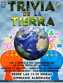 "Trivia de la tierra" es el nombre que le ha asignado nuestro Departamento de Ciencias y Tecnología a una actividad en el marco del "Día de la Tierra", donde los niños y niñas de quinto, sexto, séptimo y octavo año básico participan demostrando todos sus conocimientos sobre nuestro planeta. Cabe destacar que esta actividad se desarrolla en el gimnasio, dentro del horario de almuerzo.